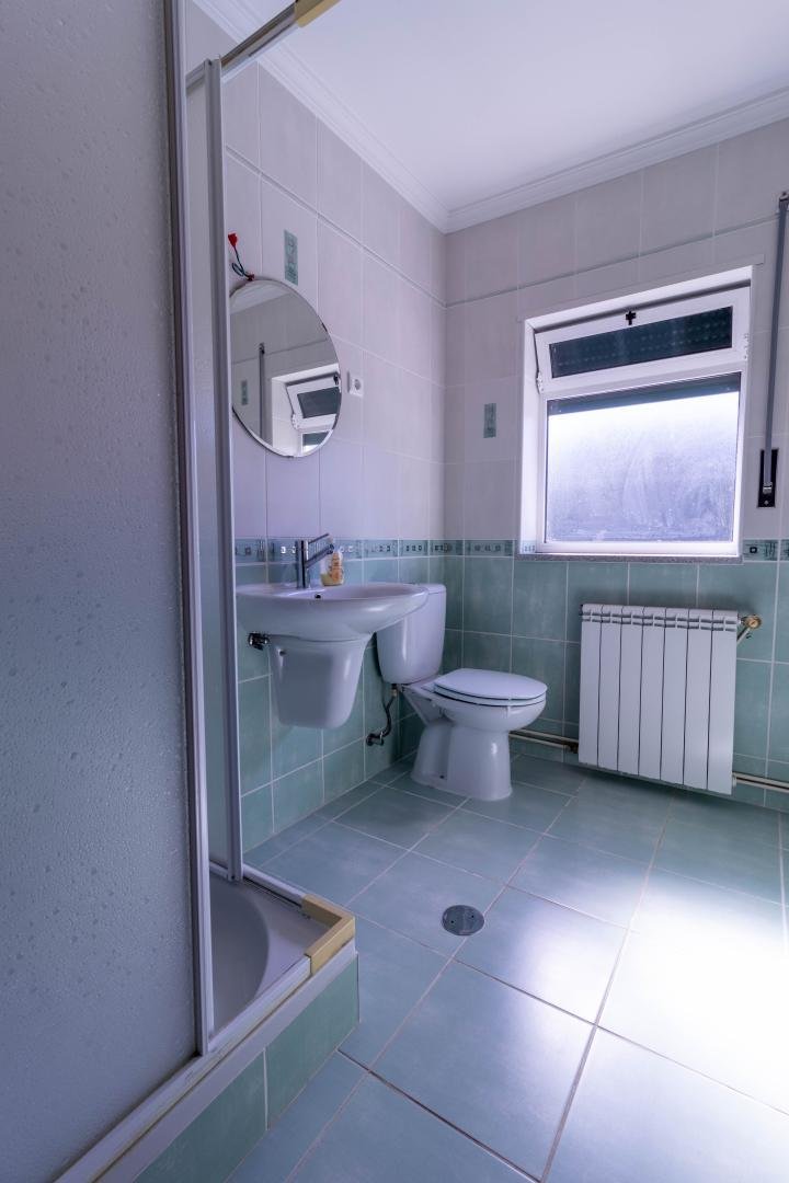 O primeiro andar dispõe também de três quartos, sala de estar com lareira e sala de jantar, cozinha equipada com fogão a lenha, 2 casas de banho completas, aquecimento central e varanda.